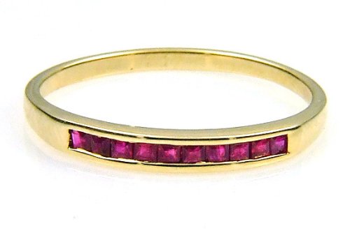 What a beautiful ring at a fantastic price! This beauty has .38 ctw of princess cut, channel set, NATURAL rubies. It is much prettier than the pictures! The setting is solid 10k yellow gold. The band is just 2.5 mm wide at the crown, tapering to 1 mm on the shank. It weighs 1.4 grams and is a size 8, slightly sizable by your local jeweler.