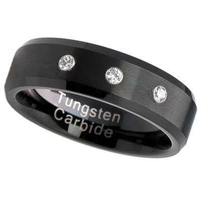 This Tungsten Carbide Ring is 8mm wide, comfort fit, black plated and has beveled edges and three CZ simulated diamonds.
