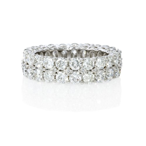 This beautiful 18k white gold eternity wedding band ring, features 69 round brilliant cut white diamonds of F color, VS2 clarity and excellent cut and brilliance, weighing 4.46 carats total.