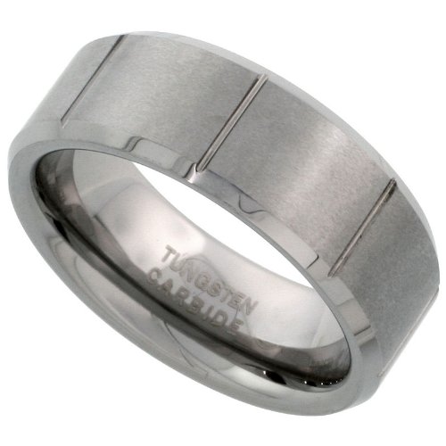 Tungsten 8 mm (5/16 in.) Comfort Fit Flat Wedding Band Ring Brushed Finish Beveled Edges & Vertical Grooves (Available in Sizes 7 to 14) Review