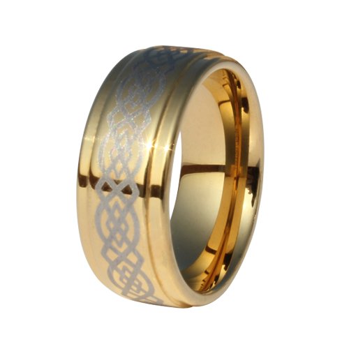 A great way to show that your love will last forever with this Tungsten carbide 9mm comfort-fit wedding band. Laser-engraved celtic style with double infinity grooves. Outside is gorgeous 18k gold with Tungsten underlay. Highly polished finish combined with detailed cratfmanship make this ring unforgettable. This ring's glossy finish and etched celtic design make a bold statement. Hand-crafted, lightweight, and durable make this men's band is perfect for an upcoming engagement, anniversary gift or to update/replace an existing wedding ring. Extra Wide 9mm Tungsten Band.