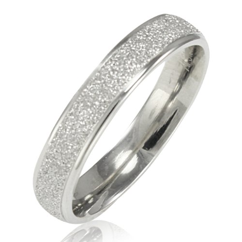 A shiny simple stainless steel band ring with shimmer stardust all around. This sparkling ring is 3.8mm wide and available from size 5 to 8. We use high quality stainless steel which has high resistance to rust, corrosion and tarnishing and requires minimal maintenance in order to keep jewelry looking like new. You can get the matching men's ring to make this a couples ring set for your love ones (Product number 508506.9935M).